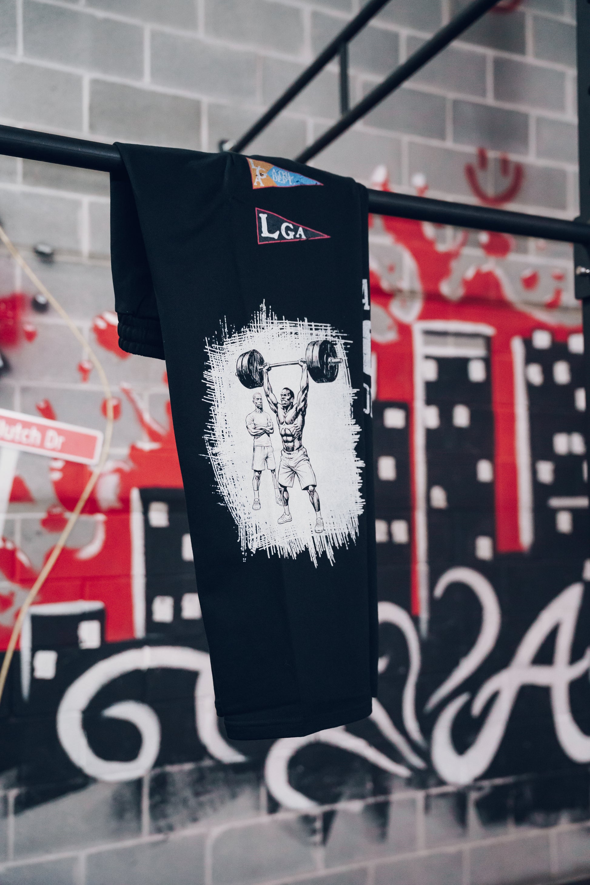 From the barbell illustration to the “10 Dept.” hits and classic LGA pennants, every detail pulls from old-school training culture with modern execution. Whether you’re in the gym or outside it, these move with purpose.