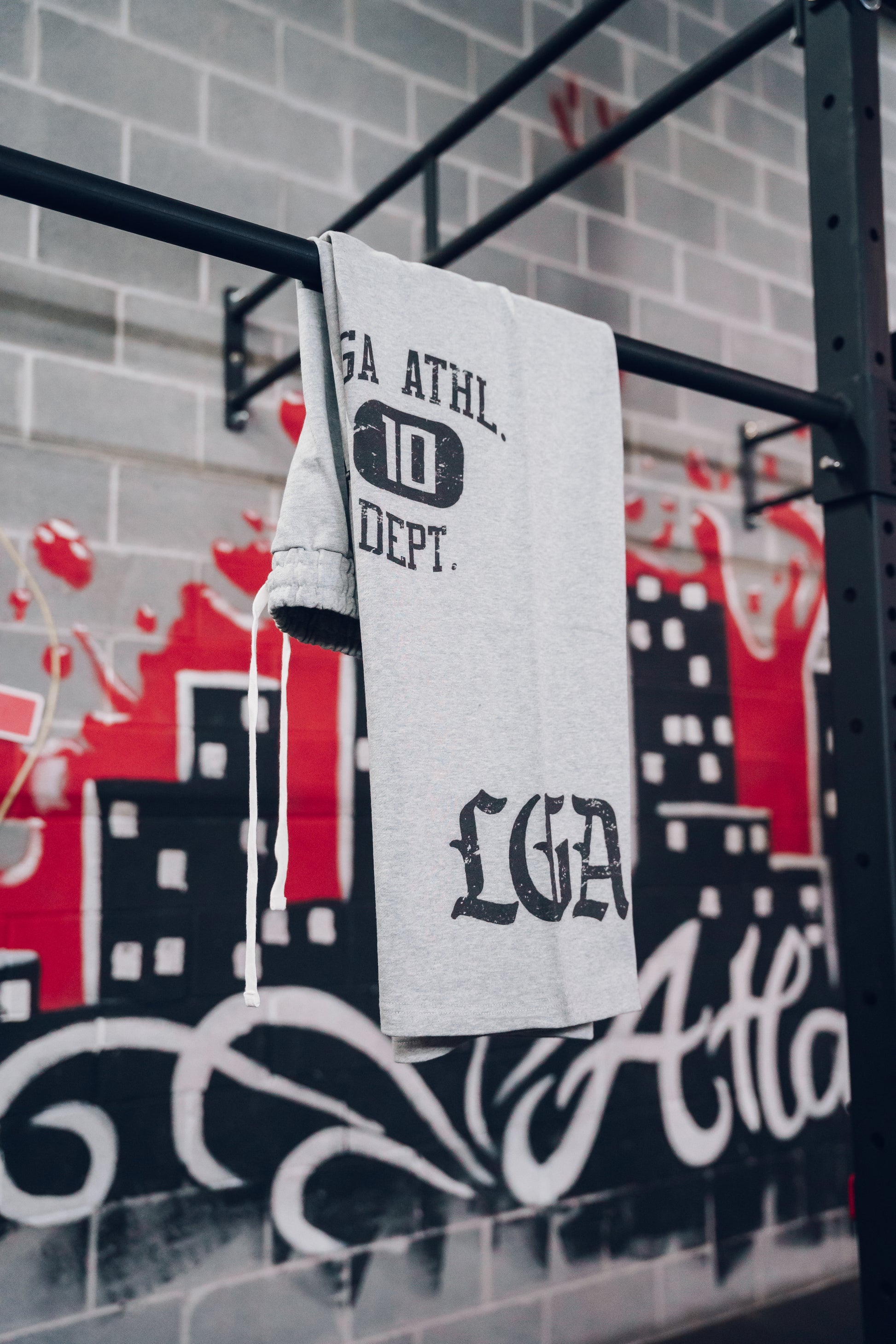 - Vintage barbell illustration and “LGA ATHL. 10 DEPT.” graphics